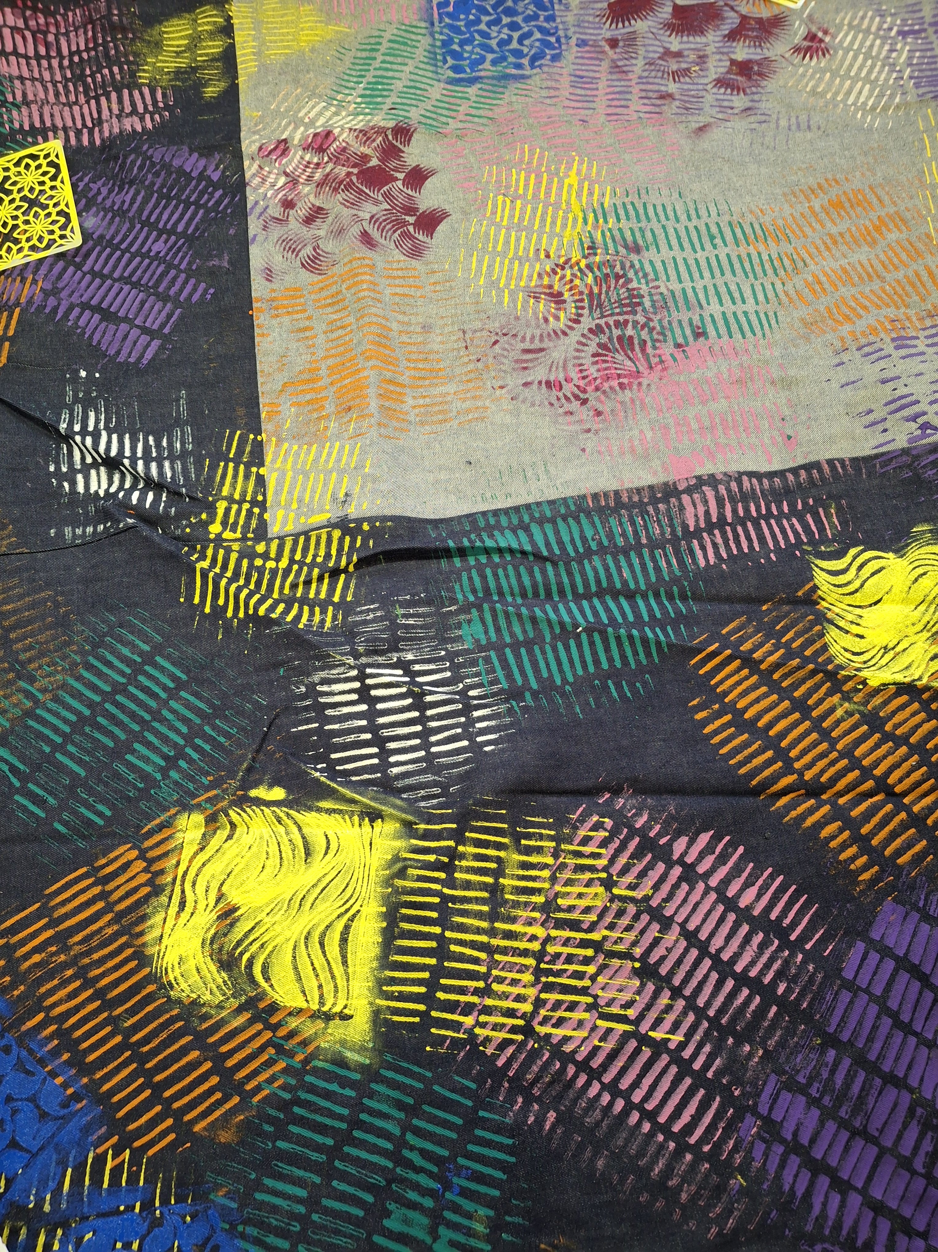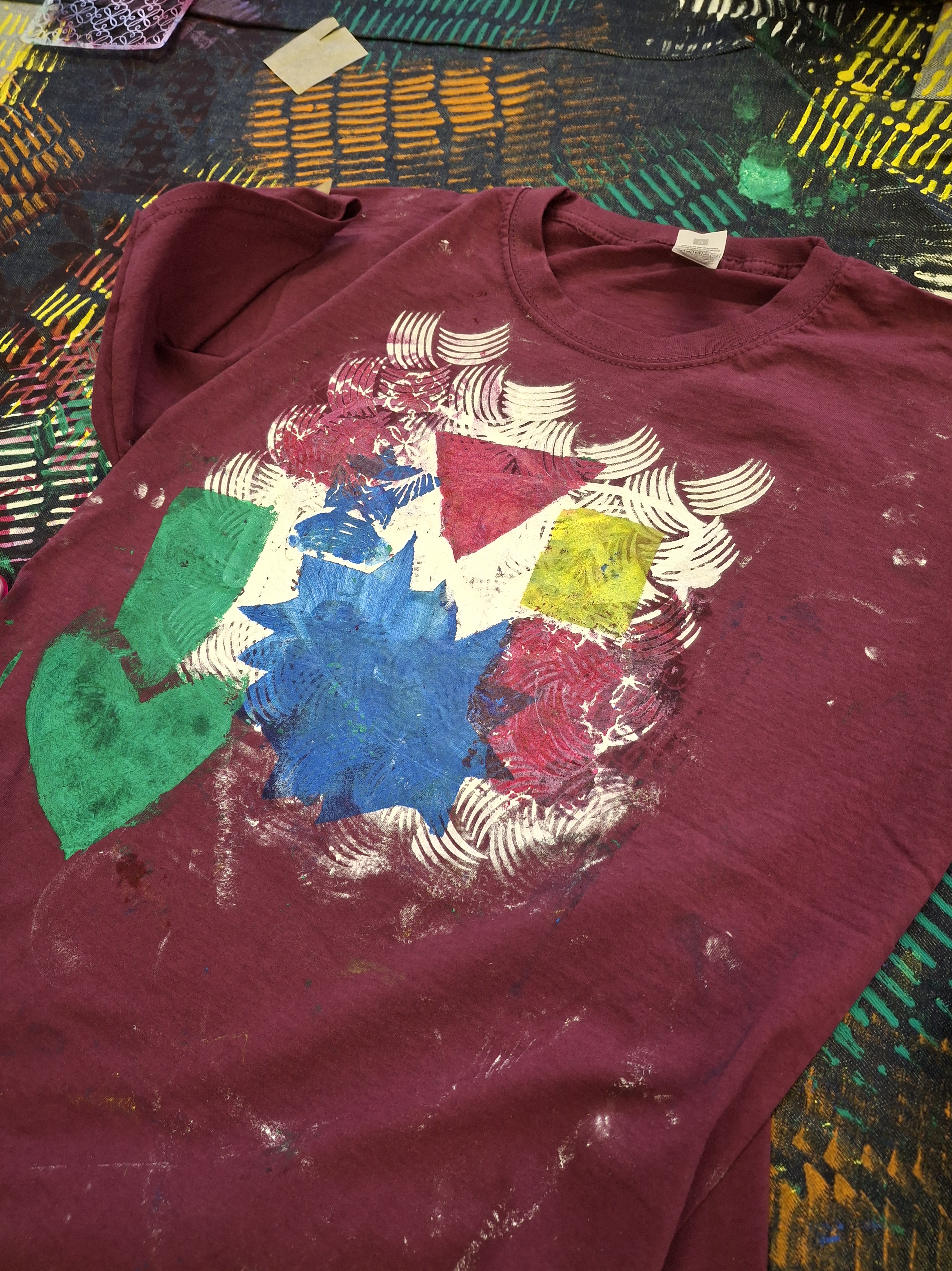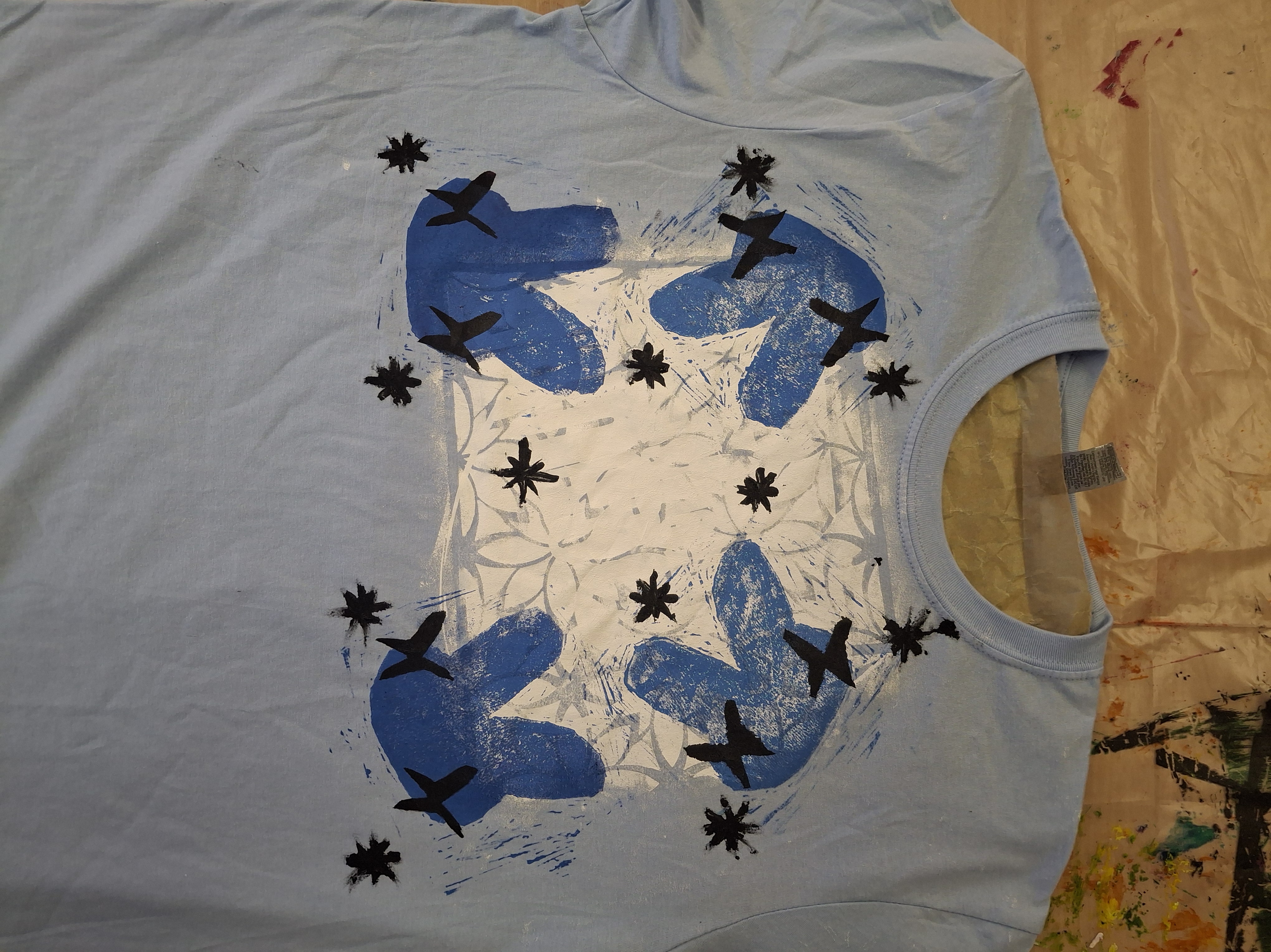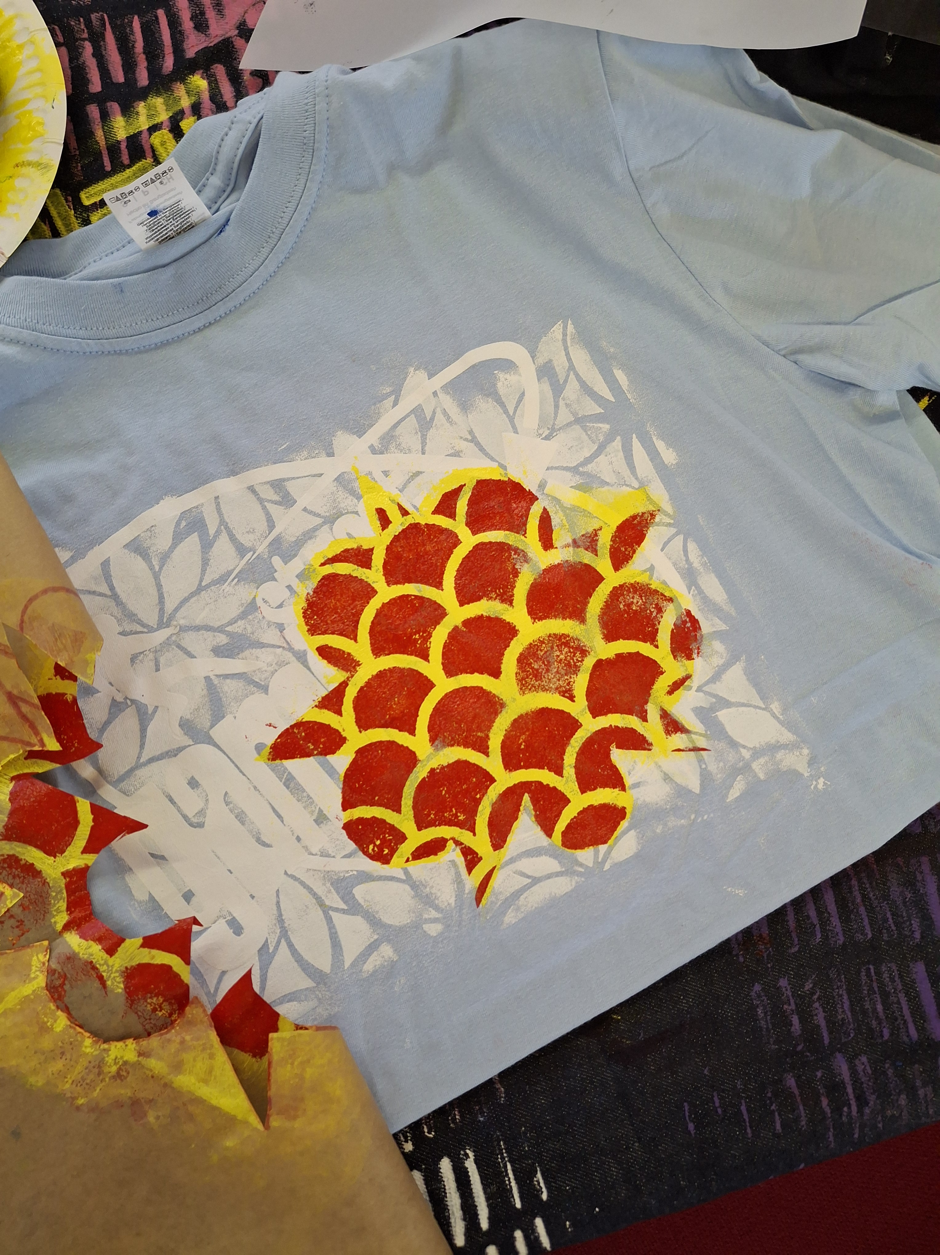 On the second day, we collaborated to print a huge patchwork piece of denim fabric with different colours & textures making sure we got a good balance of colours to produce a vibrant and cohesive print. Ibukun will use this fabric to produce big seat cushions that will decorate some benches at Matthew Moss Youth Centre. On our t-shirts, we created baking paper stencils by drawing a design out, cutting it out from the centre and then applying fabric paint with a sponge.