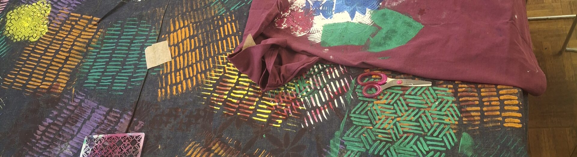 This August, we held our second Summer School at Matthew Moss Youth Centre with textile artist Ibukun Baldwin. Over three days, we upcycled unworn volunteer t-shirts, starting off by applying a textured base print with stencils to cover up the original logos.