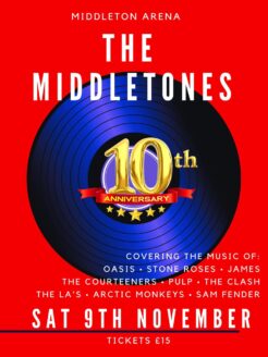 Come and celebrate the 10 year anniversary of The MiddleTones live at Middleton Arena. Experience the electrifying energy of this talented 4-piece band hailing from Middleton. Their captivating performances transport you back to the iconic 90s Britpop/indie era with some older classics and modern anthems thrown in as well, as they flawlessly cover songs that defined a generation.